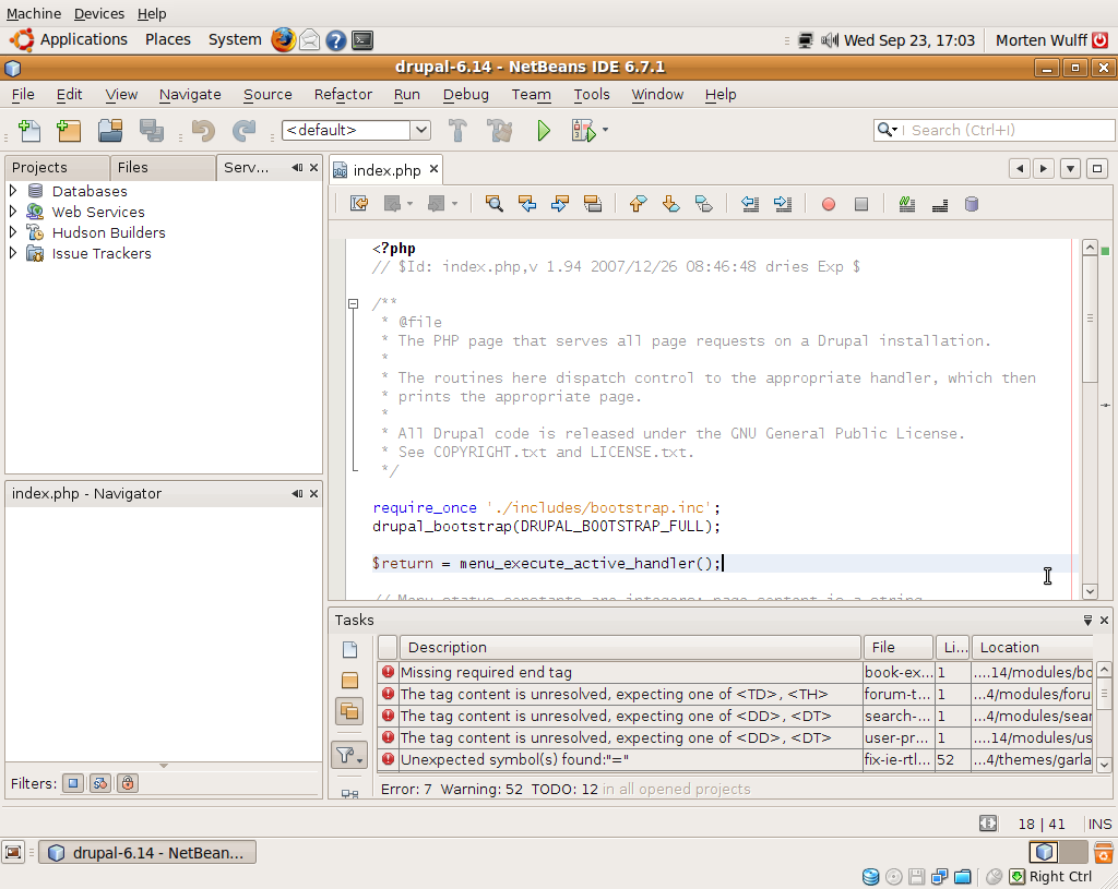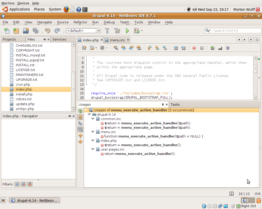 Open index.php in the root of the Drupal folder and place the cursor somewhere in the function name menu_execute_active_handler() on line 18. (Choose View → Show Line Numbers to enable line numbers in the editor.) Right-click the function name and select Navigate → Go to Declaration or press CTRL+B. NetBeans now opens the file menu.inc where the function is defined.
